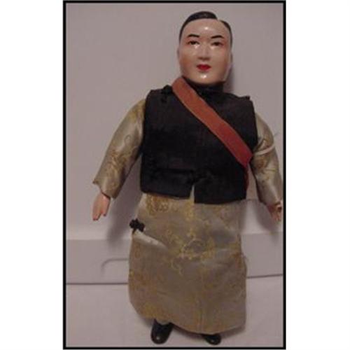 Composition type Chinese Man, painted features, some crazing on parts. Body is cloth, Composition chipped off little finger on one hand and thumb is off other hand. Nick off the tip of one shoe. Some fading on material.
