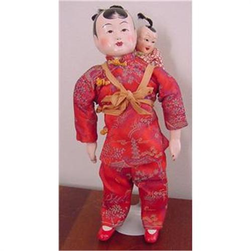 Here is a neat Chinese Mother and Child. There is light crazing on the face paint, a few rubs, the baby also has some rubs from laying next to the black hair on the mother. I think his nose has a slight rub to it also. The other has two braided pigtails coming from the head and the baby has one on the top of the head. Baby measures 6". They have cloth bodies. <P><P>Email with questions.