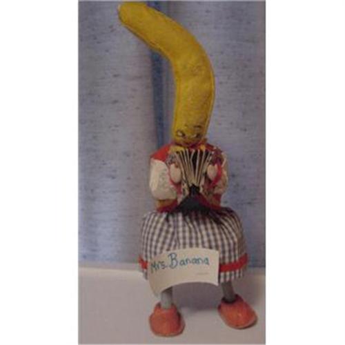 <P>10.5" Cloth Made in Italy Fruit Doll Mrs. Banana. She show some wear on the felt head on the front. There are no holes. She is tagged Made in Italy and 100% Pure Wool, made in the 1950s. A great comical fruit character. I will do combined shipping for you. </P>