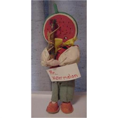 <P>9" Mr. Watermelon Man Doll made in Italy in the 1950s. Has the Made in Italy cloth tag and it also says 100% Wool. He is in great condition other than some dirt or soil on the pants. Face is really nice and he is holding a glass wine bottle with straw in it. </P>