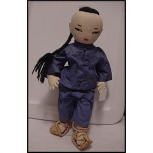 14" cloth doll, ADA LUM, doll is stamped on the body and also has a cloth tag sewn into the side seam. Embroidered facial features and yarn long pigtail. Woven shoes.