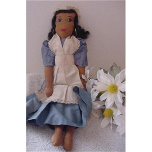 15" black cloth doll, dressed in a maid outfit. The blue is faded on the front. White apron isn't white anymore. On the inside on the hem of the skirt is printed new orleans. <P><P>Got questions, email before you bid.
