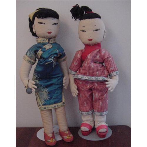 Wonderful pair of ADA LUM cloth Chinese Dolls, they have embroidered faces and yarn hair. The girl has her tag, a little medallion on a chain on her wrist, it says PRECIOUS JADE ADA LUM! The girl has an opened embroidered mouth and the boy has a closed mouth. They have individual fingers. The elastic on his shoes is stretched. This pair has no tears or rips, has been displayed so minor soil or dust.