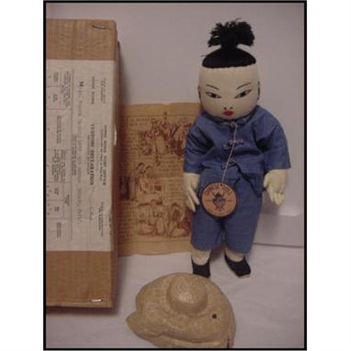<P><P>Wonderful cloth Chinese Sampan Man #519, 10" tall, made in Hong Kong and sold through the World Wide Doll Club, Inc. The original shipping box as the postmark from Hong Kong and the customs declaration on it. The little guy is mint but his hat has been crushed. There is also an interesting paper inside the box with Chinese writing and drawings on it.