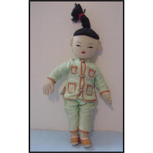Cloth Chinese doll, 14.5" without topknot. Emboridered face with yarn hair. Ears are stitched, fingers are indidivually stuffed. Darling original outfit. There is some aging to the cloth and some soil. Probably made in Hong Kong.