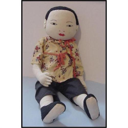 Cloth Chinese doll, measures 18". Black Yarn hair in a single braid down back. Embroidered features. There are some age spots and staining on the cloth face and body. Fingers are individually stuffed. Original outfit with socks and slippers. Cute little print on top.