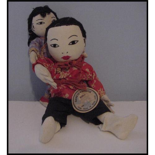 Great cloth pair of Chinese Mother and Child, 8" and 6". Mother only has socks on, might have had slippers. Dolls have black yarn hair with embroidered faces. Mother has the individual fingers of the Ada Lum dolls. Paper tag on her chest says CHINESE CHARACTER DOLL Hand Made in Hong Kong. Can't read the type on the tag.