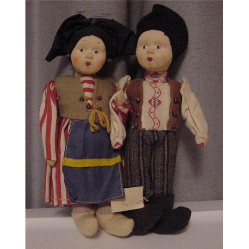 Wonderful 8" cloth foreign dolls. This couple were Made In HUNGARY. The have a lttle tag attached to the bottom of the man's trousers. Their eyes are side glancing and molded out. Wonderful costumes. There arms have wire in them and they move up and down.
