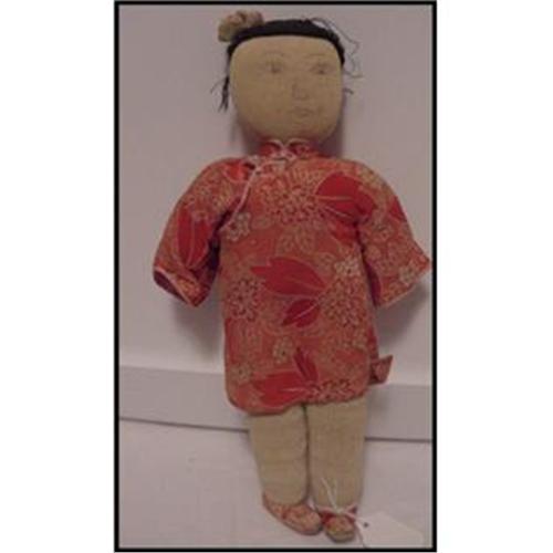 12"Old Foreign Cloth Chinese Oriental Doll. Looks like hand drawn on pencil face, thin hair, some missing, or maybe it was only made to go around the outside of the head. <P><P> Shipping is $10.00, covers shipping, insurance and handling.