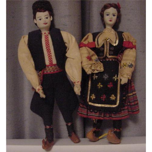 8.5" pair of cloth foreign dolls from Yugoslavia. They have embroidered features. Costumes have alot of detail. Leather shoes. The arms move up and down. Their costumes do show some aging and the lady's face is darker. There are a couple of small moth holes in the black felt on the back of her vest. She wears a pleated skirt.