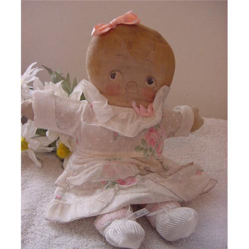 10" Grace G. Drayton cloth doll, made by Georgene Averill in 1923. There was printing in a rectangle on the back of the doll but can not read it now. I think she is one of the Dolly Dingle dolls. No original clothing. The little bow has been tacked on by someone. There is a squeaker in the body but it doesn't work any longer. Soil on doll, especially on arms and legs, where exposed. The hands have some worn spots. There is a little tear on the leg. Cute face, you can see some of the eye paint has worn off. <P><P>Got questions, email before you bid.