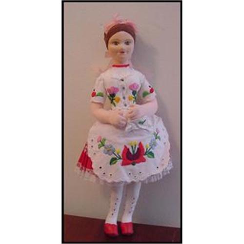 12" cloth doll representing Hungary. She has an embroidered apron and hold a handkerchief. Brown painted eyes and brown string floss hair braided in a bun in the back. Red necklace.