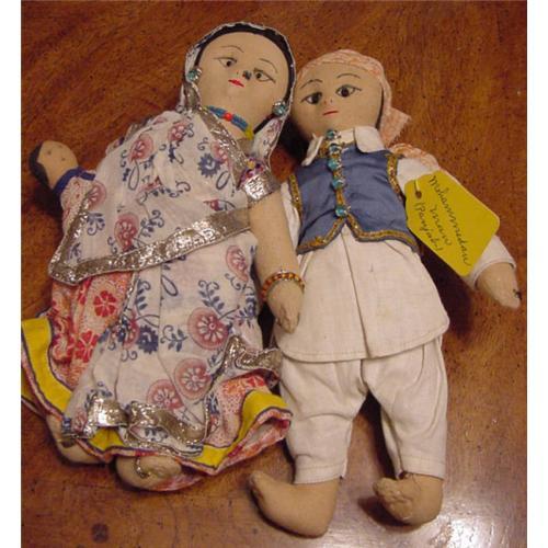 Pair of Made in India cloth dolls, both have black beads for eyes. He has a tag that says Mohammedan Man Panjabi. She is holding a bby on her hip. She has a decoration in her nose. Very nice pair. You are getting the pair for one bid. <P><P>Got questions, email before you bid.