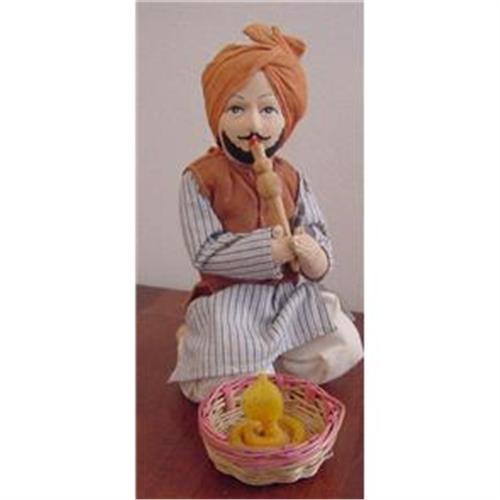 8" Cloth International Snake Charmer Doll. Hand Made in India. He is sitting on his knees and playing a wooden flute. The snake is plastic not plaster.