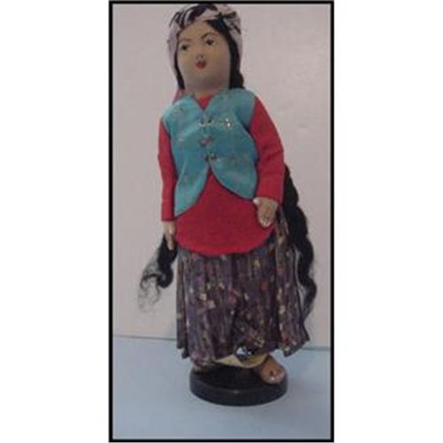 <P><P>10" cloth Hand-Made in India Woman. She has nose jewelry, painted facial features, long black braids. She wears ankle jewelry and toe rings. An unusual woman standing on a black plastic base. She has a paper wrist tag that says HAND-MADE in INDIA Himalayan Hill Woman.