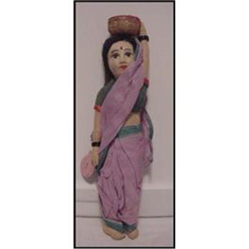 <P><P>13" cloth Hand-Made in India Woman. She carries a basket on her head, has black hair in a bun on the back of her neck. She has a paper wrist tag that says HAND-MADE in INDIA Malan Khilowna Brand.