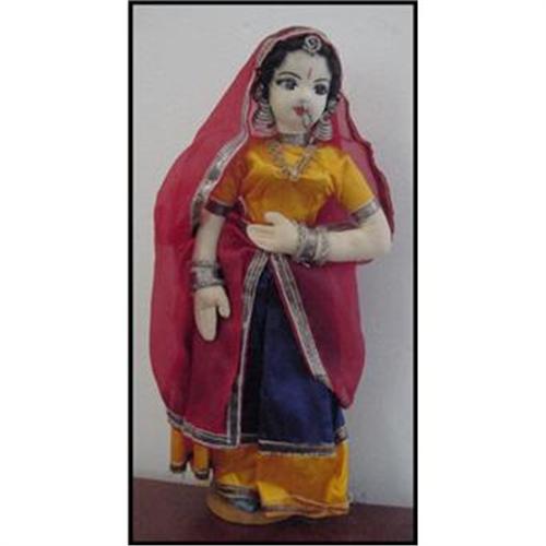 11.5" cloth India Woman from Bombay. She has painted features, a little rubbing off the right eye. She has a nose ring, large earrings, and bracelets. The trim on the bottom of the dress is messed up. Material is fine, just the trim. She stands on a wood base.