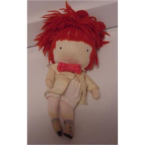 Unmarked Joan Walsh Anglund boy with red hair. AHe wears a cute little white short suit with a bowtie, elastic is stretched. I see some soil on side of face, might come off. <P><P>Email with questions.