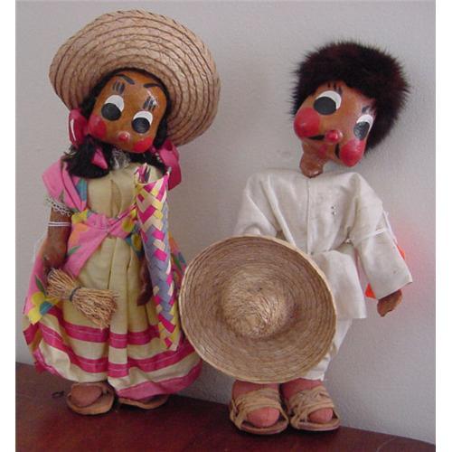 9" cloth dolls made in Mexico. The heads and are painted, bodies and legs are cloth. Nice outfits, he has a little soil on the shirt where a price sticker had been I believe.