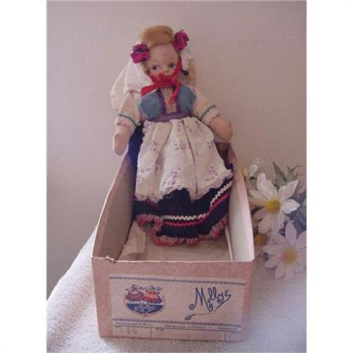 11" International MOLLYE doll. Satin face with painted features. Played with and has some marks on her face. Has the bottom of the box. <P><P>Got questions, email before you bid.