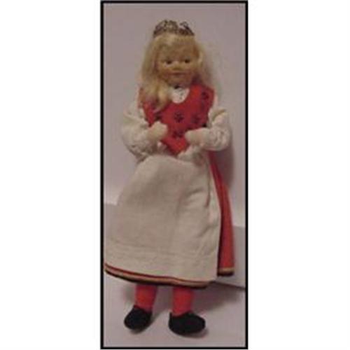 7.5" Ronnaug Petterssen Doll, made in Norway. She has painted side glancing eyes, blonde mohair wig, she has some soil on her white apron and face. Looks like a little line on the side of her nose. There is no tag on her. No moth holes. She wears a gold braid type crown.