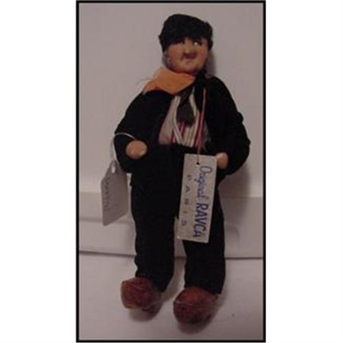 8" cloth Ravca Man, tag says POLAND. He has hand painted features, MADE IN RAVCA cloth tag sewn on back of jacket. He also has the silver ORIGINAL RAVCA tag and is signed B. RAVCA on the back and has the word POLAND printed on top. He does have a tiny hole in the nylon on the tip of the nose, and some holes on the the hands. The smaller size dolls don't show up often. Amazingly good condition for a doll made in the 1930s. Came out of the Bernard Ravca Estate Sale.