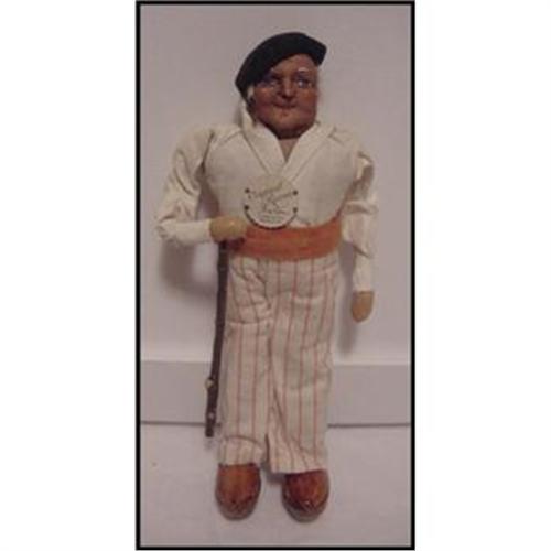 <P><P>10" Cloth doll with walking stick, made in France by Bernard Ravca. The Original Ravca paper disc on shirt says GASCON. He has the MADE IN FRANCE red printed tag on back. Ther eis some soil on the back of the pants. He has a tiny hole on the tip of the nose. The one hand has some damage to the nylon.