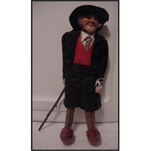 10.5" cloth Ravca Man with walking stick. He has hand painted features, black felt jacket, MADE IN RAVCA cloth tag sewn on back of jacket. Very unique costume, he has a couple of tiny holes on the face, and the felt vest has some slight damage. Amazingly good condition for a doll made in the 1930s. Came out of the Bernard Ravca Estate Sale.