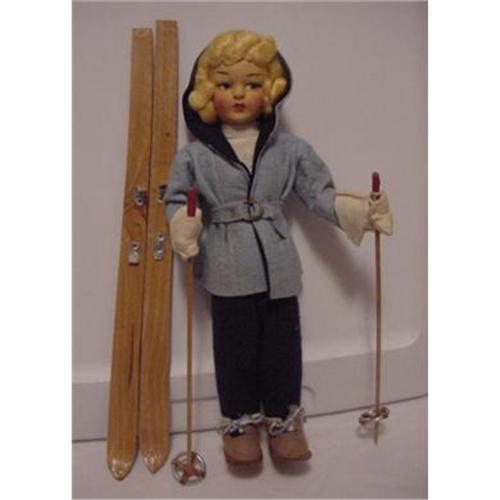 11" cloth Ski doll with painted features, great costume. Wooden skiis and poles. One metal piece broken on one ski. Box is not in great condition, is written on and broken down.