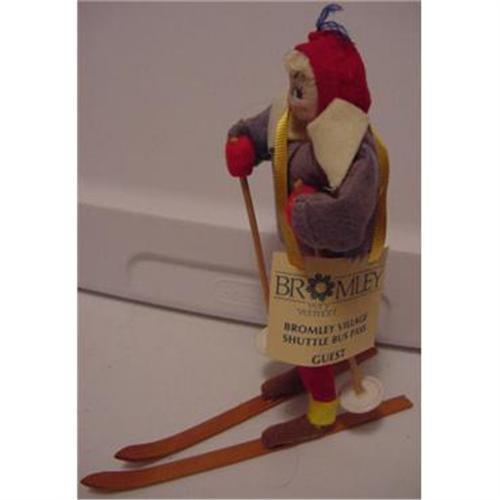 Cloth Skiier with wood skis. Made in Japan sticker on bottom. Some fading on outfit. Painted features. Has a BROMLEY Village Shuttle Bus Pass for a Guest around its neck. <P><P>Email with questions.