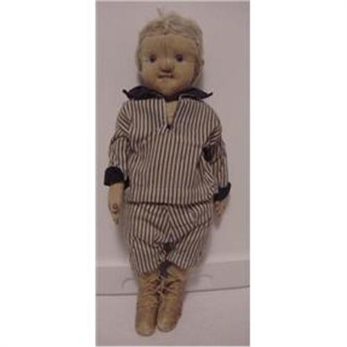 16" cloth Steiff Man, has been played with and felt on hands has worn through. He has been well played with but still has his original fur hair, and the Steiff button in the ear. Clothing is not original. Made in Germay by the Steiff Co.