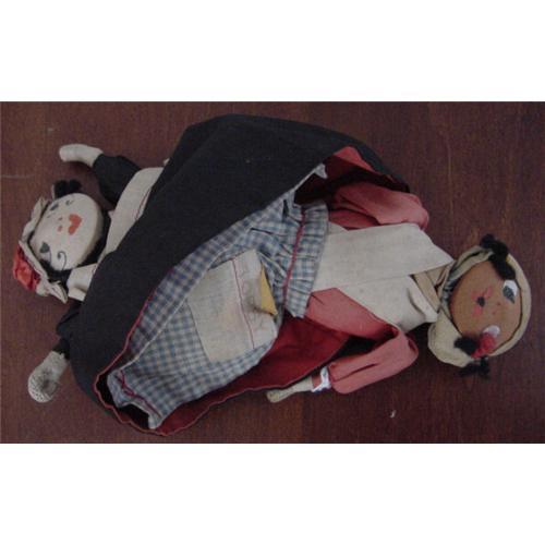There is fading on the red mateiral and the hat. The black dress is ok. There is some surface soil. The black dressed doll has earrings. Both dolls have painted features and some black yarn for hair. The hands look like some kind of rope material. <P><P>Email with questions.