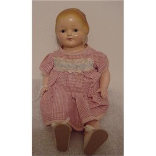 13" composition Effanbee Baby Dainty, played with and cracked. The head has a nice face but head has cracks and crazing on it. It is a shoulderplate, marked Effanbee Baby Dainty on the back. Body is cloth, arms and legs are composition. Dress is not original. Might be a good fix up project for someone. <P><P>Got questions, email before you bid.