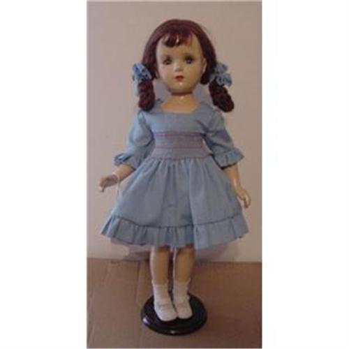 <P><P>18" composition Madame Alexander Doll, has been played with and has had some repair bur still retains original wig. The doll is marked Alexander on head and on back of torso. The right eye has had a split filled in and painted over but not done by a professional, so it shows. Doll has some crazing all over and some filling in done. Dress is a newer made smocked dress. Eyes are clear and open and close on their own with good lashes. The little clover tag is something that the lady made, it is not original. Please check pictures and be sure and ask questions as this is not a mint doll. <P><P>Shipping is $15, covers shipping, handling and insurance.