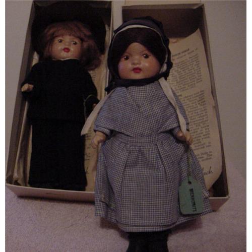 8.5" composition couple, Pennsylvania Dutch Dolls, Mennonites. These have painted features, jointed at the shoulders and hips. Both comes with wrist tag and paperwork and original box. Even the box is marked. Great condition. <P><P>Got questions, email before you bid.