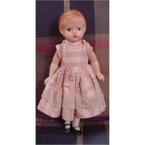 Here is the little composition WEE PATSY made by Effanbee. She is jointed at the shoulders and the hips. She has painted features and is a little miniature Patsy, standing approximately 5.5" tall. She has painted on Mary Jane black shoes with white ribbed socks. Composition has a little rubbing on it but not bad. She has a ittle cracking on the face around the mouth and at the top of the forehead. NO repaints or touchups, etc. Dress is not not her original outfit but has been on her along time. Am pretty sure it is a Nancy Ann dress with the gold snap at the waist. <P><P>Email with questions.