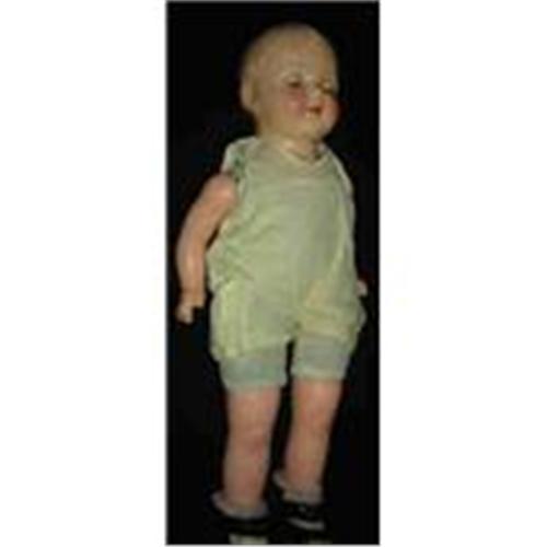 Composition Head, legs and arms.. Sleep eyes. Open mouth showing tongue and two teeth. "Mama" button works now and then. Worn out shoes.Stuffed body. Molded hair. Slight remains of glue on head, from a wig?