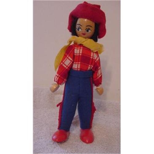 7.25" Wood Made in Poland Cowboy doll. There is a MADE IN POLAND sticker on the bottom of the foot. Painted features. Arms are a little loose. Moveable arms and legs. <P><P>Got questions, email before you bid.