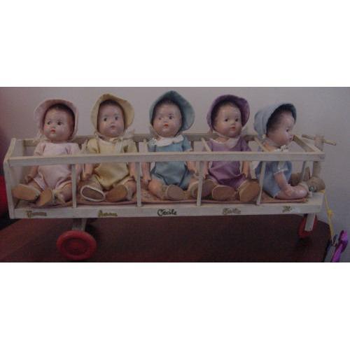 They come with their rare transporter TRICYCLE made of wood with decals with their names on it. Some of the decals are scratched and missing part of the name. This is a wooden tricycle of sorts. I have never had the opportunity to buy another one of these, don't think they show up much. This set has been together from the beginning. Came out of an estate in Georgia quite a few years ago and has been in my collection ever since. Madame Alexander did a great job on these little babies and their accessory.