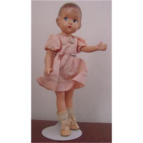 <table width="100%" border="0" cellspacing="0" cellpadding="4"><tr><td><em> </em></td></tr><tr> <td width="100%"> 9" all jointed composition Effanbee Girl Doll with molded hair and painted eyes. She is marked on the back of the torso EFFANBEE Made in the USA. She has some paint lose, right leg is flaking. She has a tiny chip of paint missing on the left eye. All fingers and toes, original socks and shoes. Am not sure about the dress, could be and has matching panties.