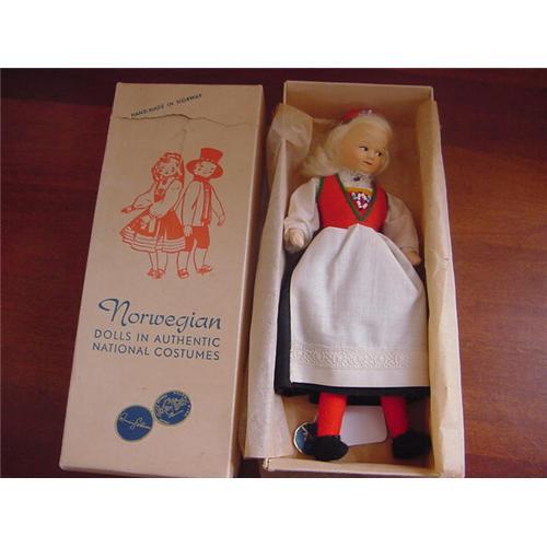 7.5" Felt cloth Ronnaug Petterssen doll from Norway. Made in the 1950s. Great condition still in original box with stickers on it. Has some aging to the box and a tear across the top. Says Norwegian Dolls in Authentic National Costumes on box and sticker says Made in Norway and one has Ronnaug Petterssen on it. Has the Ronnaug Petterssen tag lose in the box. Box says SETESDAL GUTT on end.