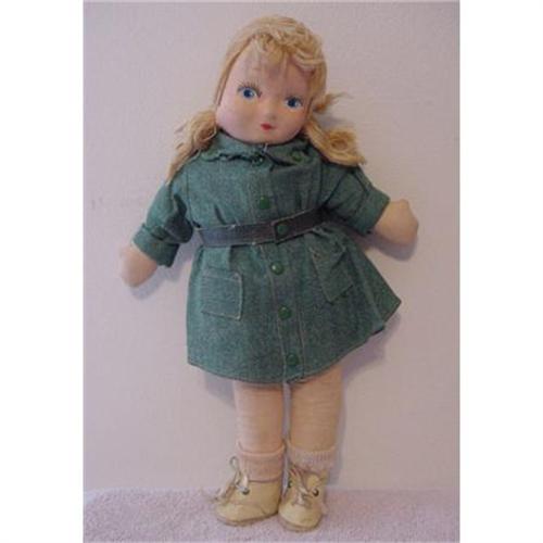 13" Mask Face Georgene Novelties Girl Scout Cloth doll. She has been played with, has some wear to the face, painted features. She yellow string floss hair, wears original outfit with matching panties and belt. There is no hat.