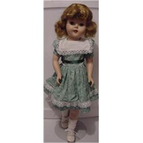 21" HARD PLASTIC WALKER DOLL from the 1950s. She is marked 210 on the back. She has a saran wig, open and close sleep eyes, open mouth with teeth. She is a walker and her head moves when her legs move.