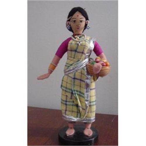 Here is 9.5" cloth woman made in India. She has a painted on cloth face, and her arms and legs are yarn wrapped. Hair is made of black string yarn. Her hands and feet are flat, she is nailed to the wood base. <P><P>Email with Questions.