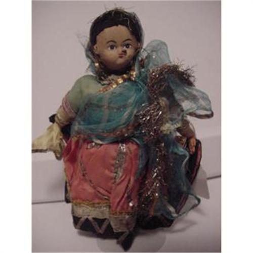 8.5" Cloth India lady, wears metal earrings, has nose jewelry, necklaces, ankle jewelry and bracelets. Painted features, black string type hair, material is silk and chiffons, some wearing and shredding to the silk, back of head scarf is torn also. Her skirt is attached to her wrist and she holds a handerchief in one hand. I think she might be a dancer.