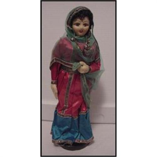 Beautiful cloth India woman, hand made in India. Different painted face than most, red dot on forehead, chiffon scarf, nice outfit. Stands on a black wood base.