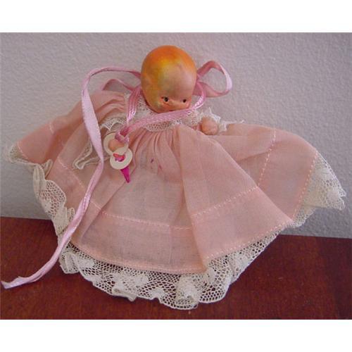 3" JAPAN bisque baby, made in the Nancy Ann Style. The outfit is wonderful, Diaper is still pinned on, has socks with pink ribbon around them, slip with lace trim and organdy dress with lace trim and pink ribbon ties. Ribbon around one sock needs to be retied. Comes with a little pacifier on a pink ribbon. It looks like the paint has rubbed off on the dress right on the front a little. (can't tell if someone repainted it or it was just a messy job to begin with). The baby is a crude JAPAN marked baby. It has JAPAN stamped in black, then Made in Japan 8292 incised in the back. (I think it is 8299). It is jointed at the shoulders and hips. Painted eyes and open little mouth. There are some white spots ont he face where there is no paint. And there is a blemish under the one eye, that is a piece of material from the factory that was painted over. The arms have the closed fists. <P><P>Shipping is $6, covers shipping, handling and insurance.