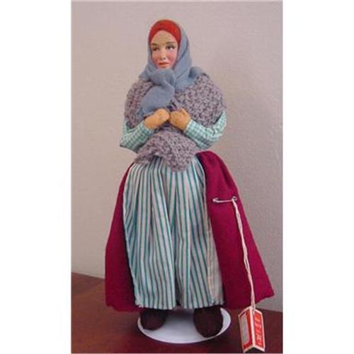 11" Made in Ireland Jays Woman doll. All original, bright red hair, painted features. She comes with her JAYS label on inside of dress, one small hole at hemline. She has her paper tag, Collectors Character Doll. Doll is handmade in Ireland. Scarf is faded. <P><P>Email with questions.