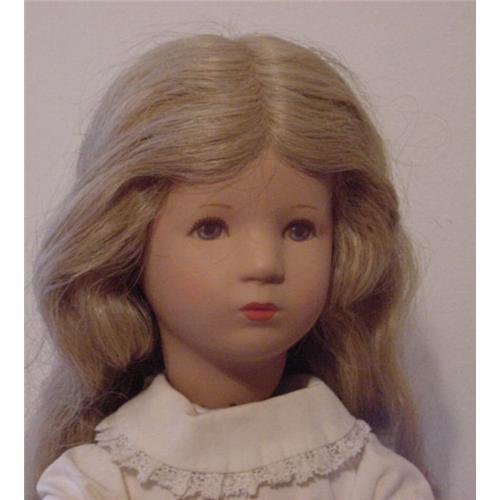 I purchased this doll along with others several years ago at an auction so I can't tell you anything about the history but will describe her to you and tell you what I think. She measures 16" from head to toe. I think she was used as a store display for Christmas, probably in the 1950s. Maybe the store sold Kathe Kruse dolls and wanted something to use in their displays. I just don't know. The head definitely appears to be a Kathe Kruse head with wonderful painted features and long flowing blonde wig. The head is like a socket head but it is attached to a weird body. The torso and legs appear to be one piece and very heavy, like a cardboard style material. The legs are real solid and have white long stockings that have been painted white along with the shoes. The stockings are like part of the leg, they are molded to the leg. The arms are on a wire rod covered with cotton to the wrist. The upper arms are cloth and the lower arms are a hard rubber material I guess as the one hand that had the hole for the candle looks to be deformed from heat. The rubber is very hard and I would not have guessed it to be rubber if it were not for the melting. The candle light still lights up when plugged in. It is an old plug and light set up so figure from the 1950s. I just can't get over how beautiful and mint the head and hair are on this item. THE HEAD IS MARKED WITH AN IX DOWN LOW ON THE NECK. Wish she could talk and tell us her story. If anyone knows about this doll, please let ...