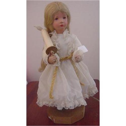 I purchased this doll along with others several years ago at an auction so I can't tell you anything about the history but will describe her to you and tell you what I think. She measures 16" from head to toe. I think she was used as a store display for Christmas, probably in the 1950s. Maybe the store sold Kathe Kruse dolls and wanted something to use in their displays. I just don't know. The head definitely appears to be a Kathe Kruse head with wonderful painted features and long flowing blonde wig. The head is like a socket head but it is attached to a weird body. The torso and legs appear to be one piece and very heavy, like a cardboard style material. The legs are real solid and have white long stockings that have been painted white along with the shoes. The stockings are like part of the leg, they are molded to the leg. The arms are on a wire rod covered with cotton to the wrist. The upper arms are cloth and the lower arms are a hard rubber material I guess as the one hand that had the hole for the candle looks to be deformed from heat. The rubber is very hard and I would not have guessed it to be rubber if it were not for the melting. The candle light still lights up when plugged in. It is an old plug and light set up so figure from the 1950s. I just can't get over how beautiful and mint the head and hair are on this item. THE HEAD IS MARKED WITH AN IX DOWN LOW ON THE NECK. She must have had something on her head at one time as there is a little netting on the ...